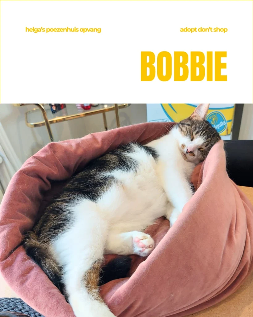 Maak kennis met Bobbie, een ontzettend aanhankelijke en sociale kattin met een hart van goud. Ze is een echte knuffelkont die niets liever doet dan ’s avonds gezellig op schoot kruipen in de zetel, om daarna samen rustig in slaap te vallen in bed. Soms lijkt ze zelfs meer op een hondje dan op een kat: ze wacht haar baasje op aan de voordeur, begroet bezoek vriendelijk en geniet volop van aandacht en gezelschap.