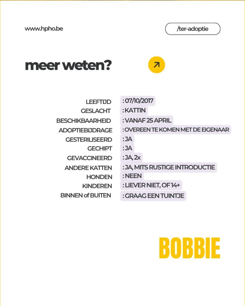 Voor Bobbie wordt een liefdevolle thuis gezocht zonder kinderen (of kinderwens), waar rust centraal staat en waar ze volop kan genieten van knuffelmomenten. Ze heeft recent ook kennisgemaakt met de buitenwereld en lijkt dit interessant te vinden, dus een veilige buitenomgeving is zeker een pluspunt.